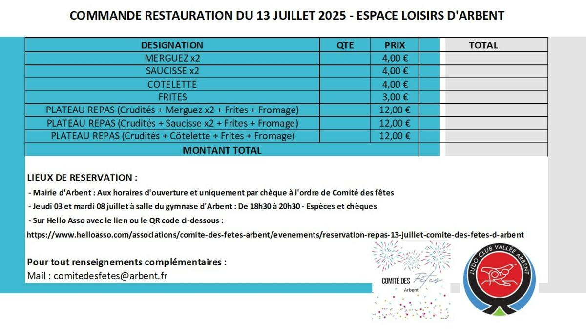 FESTIVITÉS DU 13 JUILLET - RÉSERVEZ VOTRE REPAS !