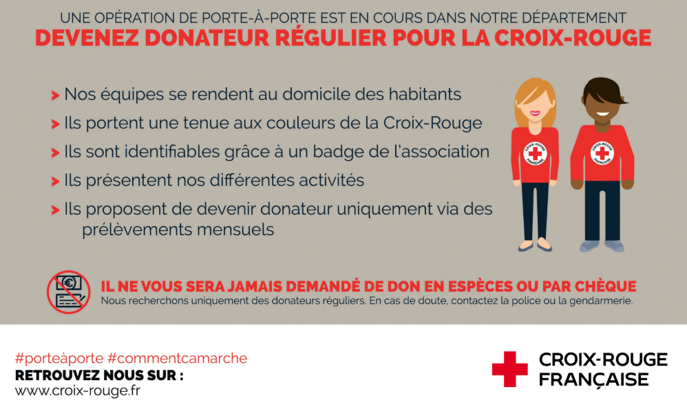 Ils passeront pour vous parler de l'association et trouver de nouveaux donateurs, à aucun moment ils vous demanderont un don en espèces ou par chèque.