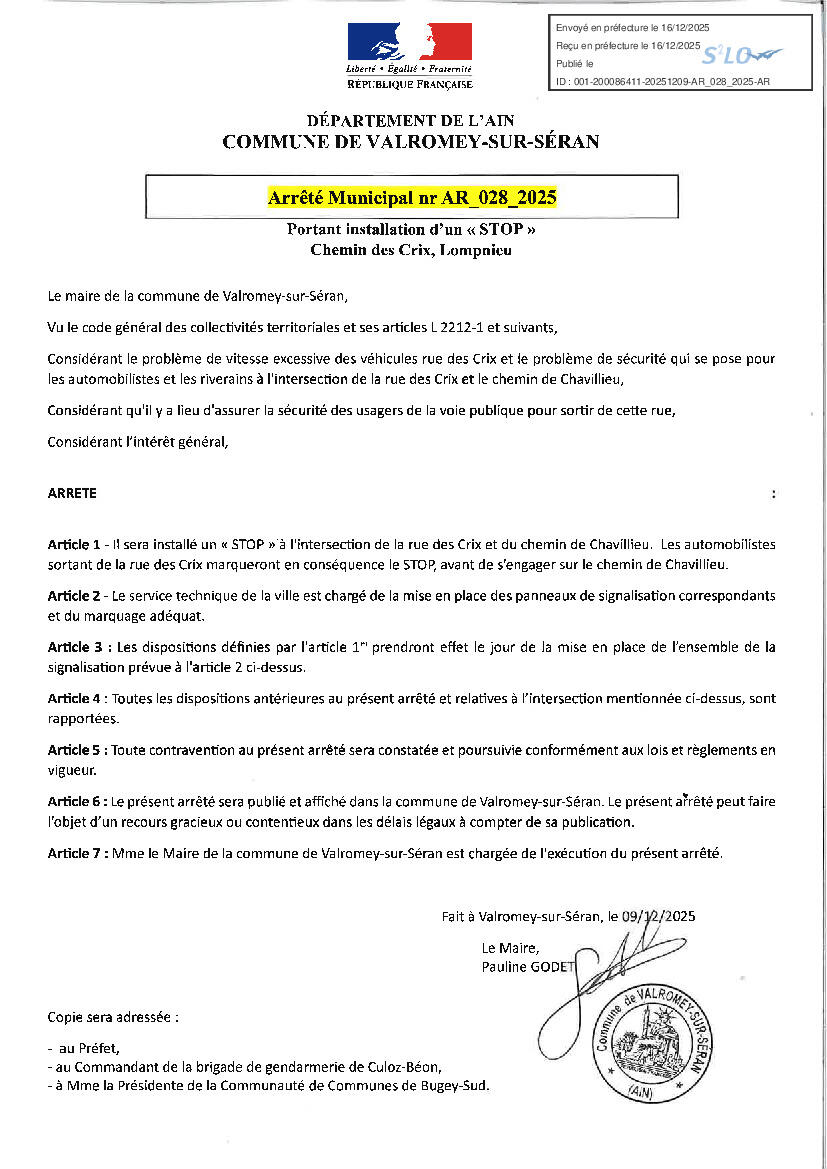 Arrêté portant installation d'un STOP à Lompnieu