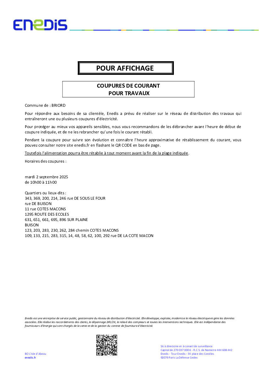 Your town hall / News / Coupures de courant pour travaux 02/09/2025