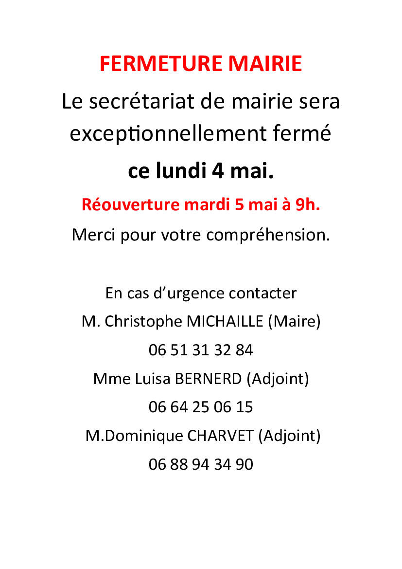 Fermeture du secrétariat de mairie 4/30/26 Le secrétariat de mairie sera exceptionnellement fermé le lundi 4 mai 2026