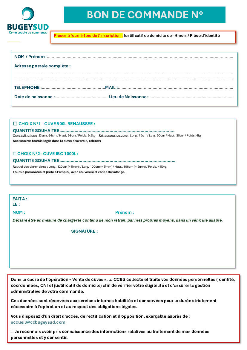Le bon de commande est accessible via le QR code présent sur l’affiche ou directement sur notre site internet : https://ccbugeysud.com/actualites/vente-de-cuves-de-recuperation-deau-de-pluie-au-mois-davril-2026/