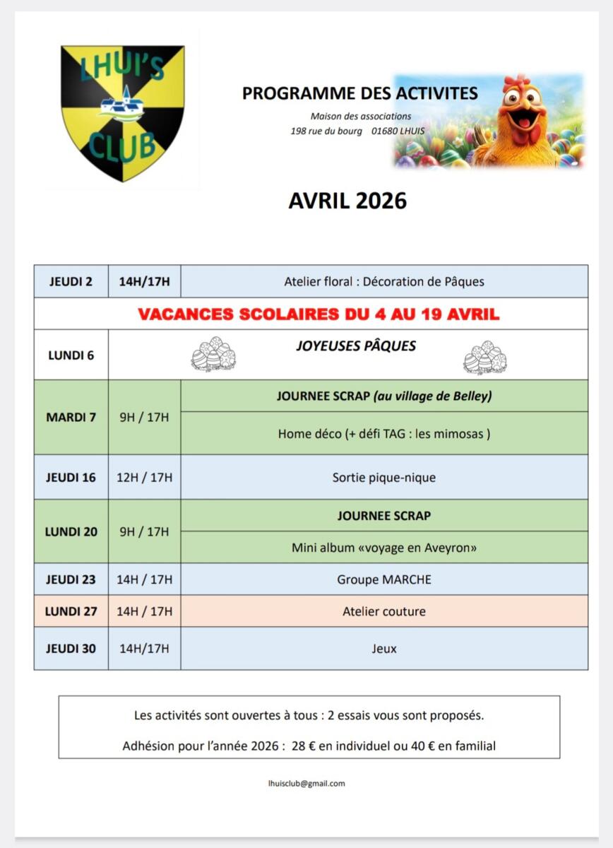 Voici le programme des activités du mois d'avril.