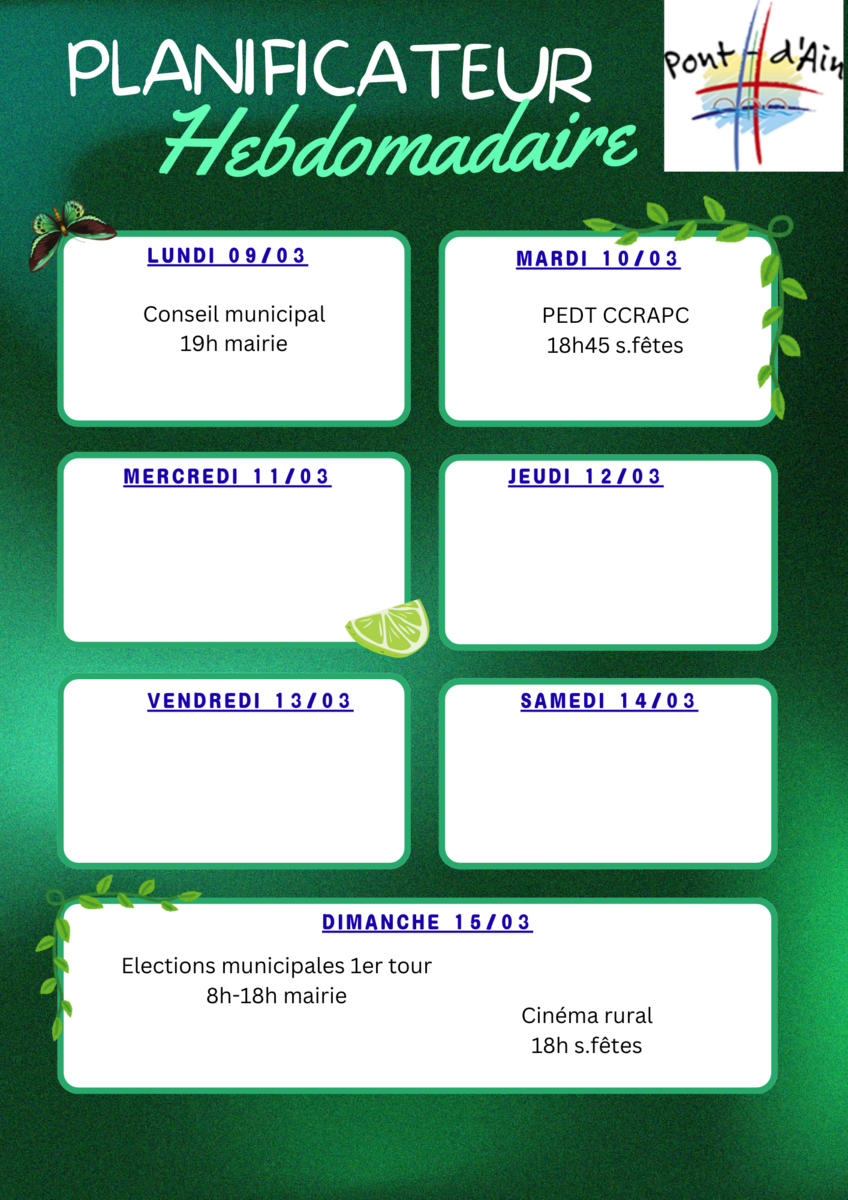 Voici votre agenda pour les deux prochaines semaines #agenda2026 #municipales2026 #AssociationsLocales #citoyennete #ConseilMunicipal #CinemaRural #icicestpontdain