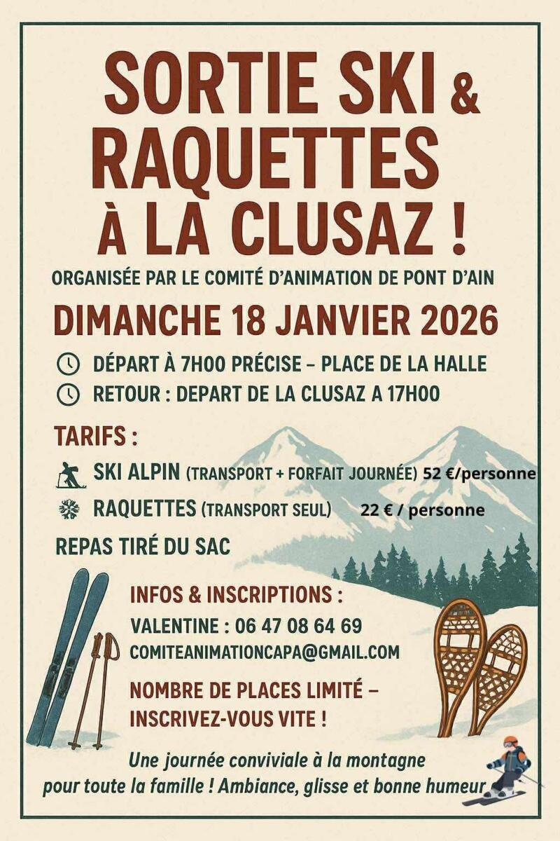 Paiement possible en ligne sur le lien suivant : https://www.helloasso.com/associations/comite-d-animation-de-la-ville-de-pont-d-ain/evenements/sortie-de-ski-station-de-la-clusaz?utm_source=app_ha&utm_campaign=share_campaign_button&utm_medium=ios&fbclid=IwVERDUAOVje9leHRuA2FlbQIxMABzcnRjBmFwcF9pZAwzNTA2ODU1MzE3MjgAAR5IeFxdCS4sa96yymAyPlU5mc0QuP1Z2BxVMSr_yHjUSB6Fx7l5Rr6rjqLHuQ_aem_gTePtKWI0FPn_2X8M3NbxA