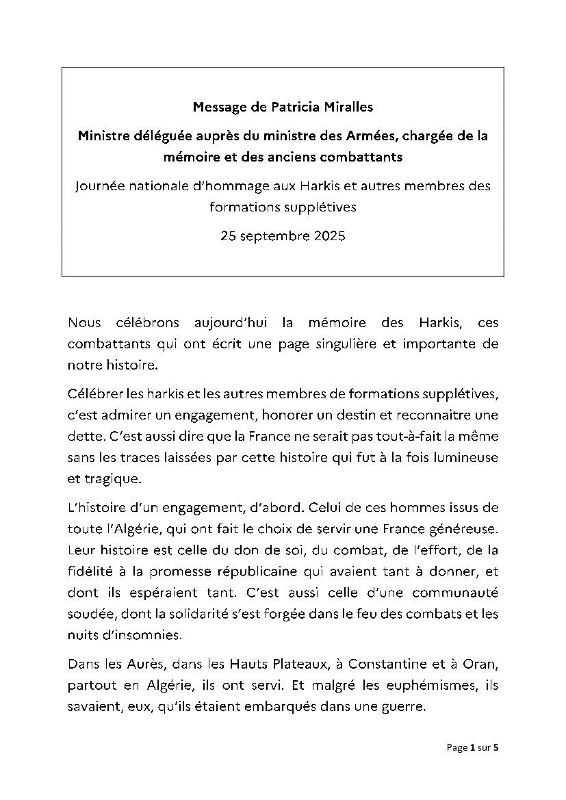 Trouver, ci-joint, le message de Madame Patricia MIRALLES, ministre déléguée auprès du ministre des Armées, chargée de la Mémoire et des Anciens combattants.