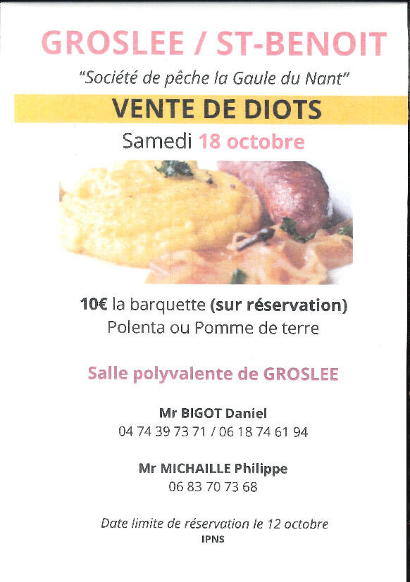 Nous vous informons qu'une vente de diots se tiendra le samedi 18 octobre 2025, en salle polyvalente de Groslée.