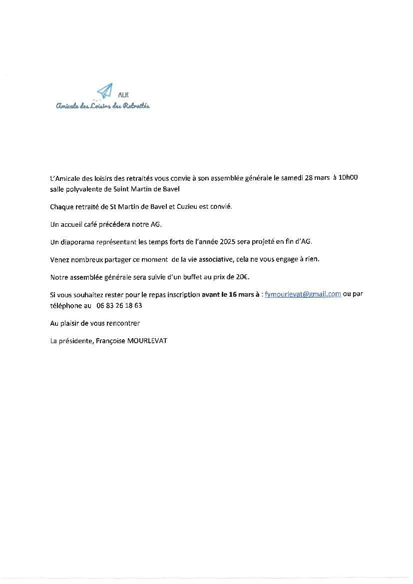 Assemblée générale de l'ALR le 28 mars à 10 h.