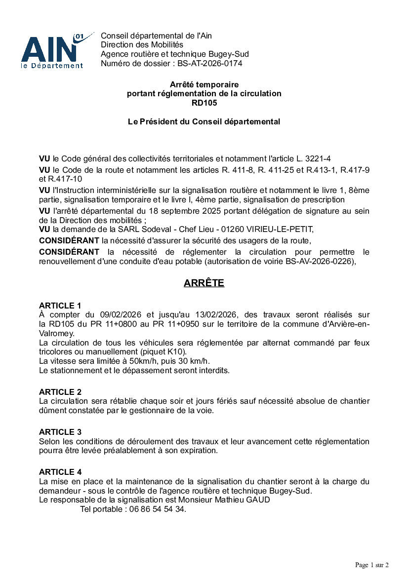 Vous trouverez ci-joint l’arrêté de circulation n° BS-AT-2026-0174 réglementant la circulation lors des travaux se déroulant le long de la RD105, sur la commune de Chavornay, pour la période du 09/02/2026 au 13/02/2026.