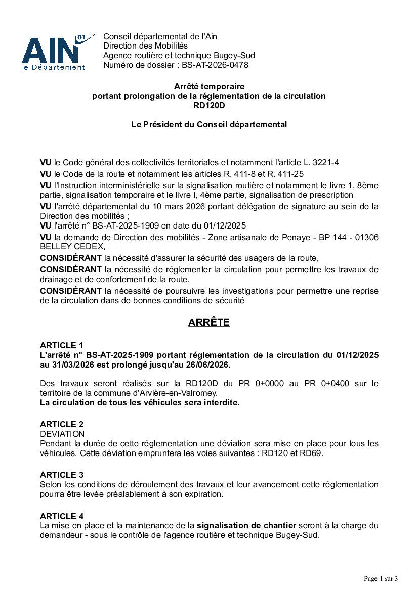 Arrêté de circulation n° BS-AT-2026-0478 réglementant la circulation lors des travaux se déroulant le long de la RD120D, sur la commune de Lochieu, pour la période du 01/12/2025 au 26/06/2026.