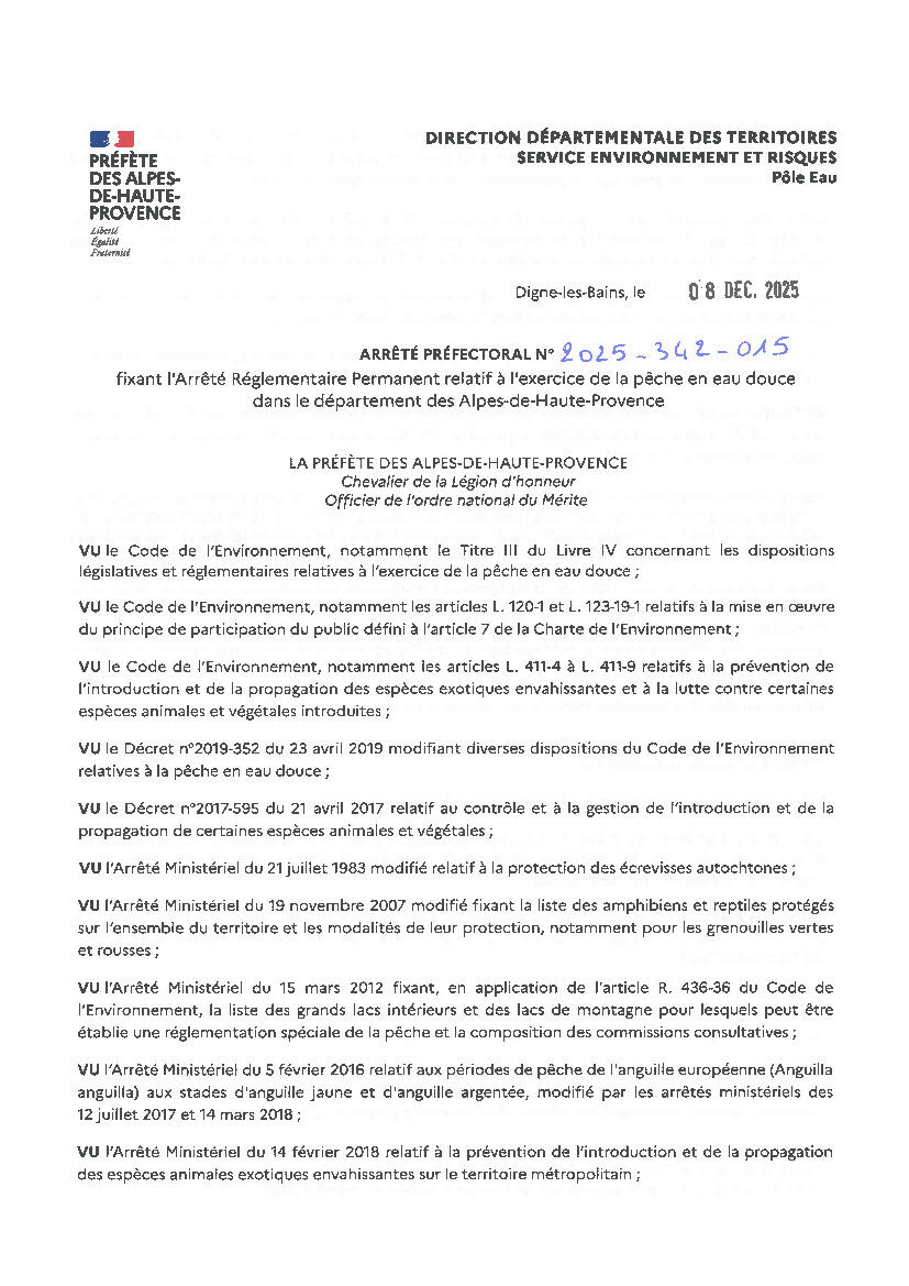 Arrêté Préfectoral exercice de la pêche en eau douce