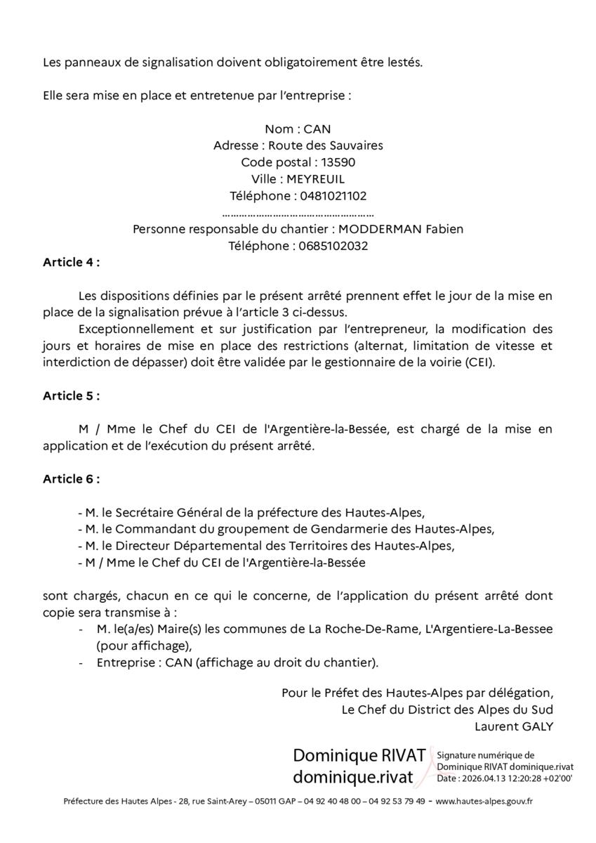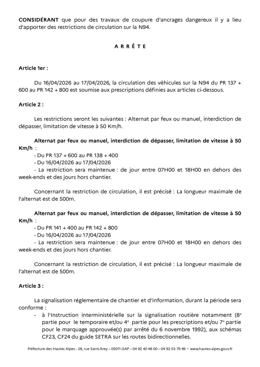 Travaux sur la N94 pour la période du 16 au 17 avril.
