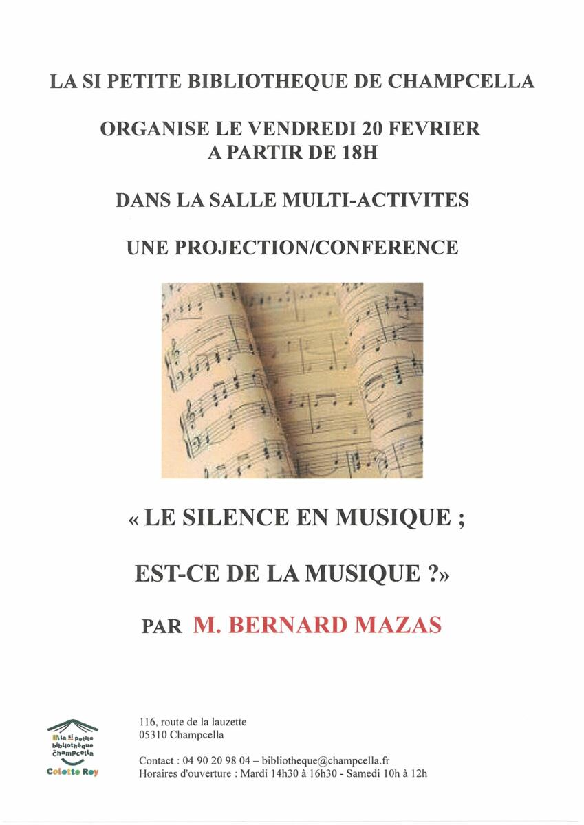 une projection-conférence "Le silence en musique; Est-ce de la musique?" par Bernard Mazas