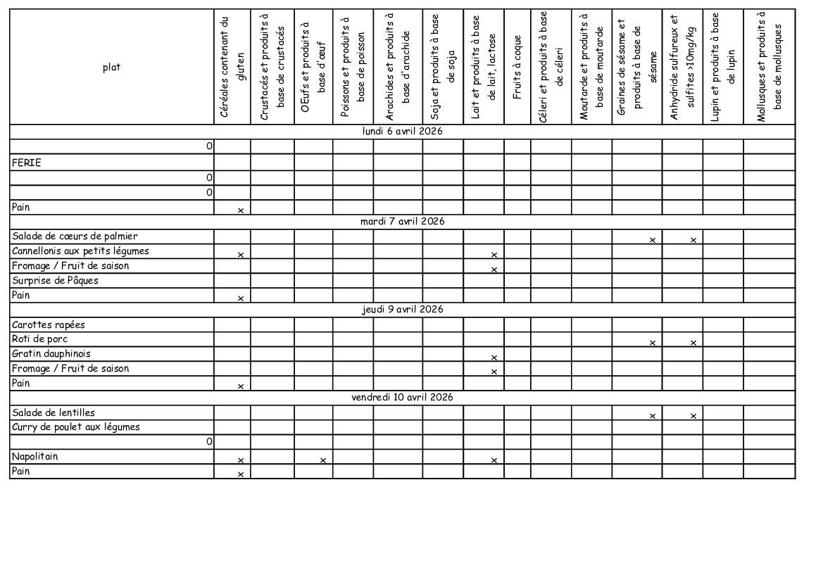 Menus du mois d'avril 2026 et liste allergènes 4/5/26 Voici le menu du mois d'avril et la liste des allergènes de la semaine du 6 au 10 avril 2026