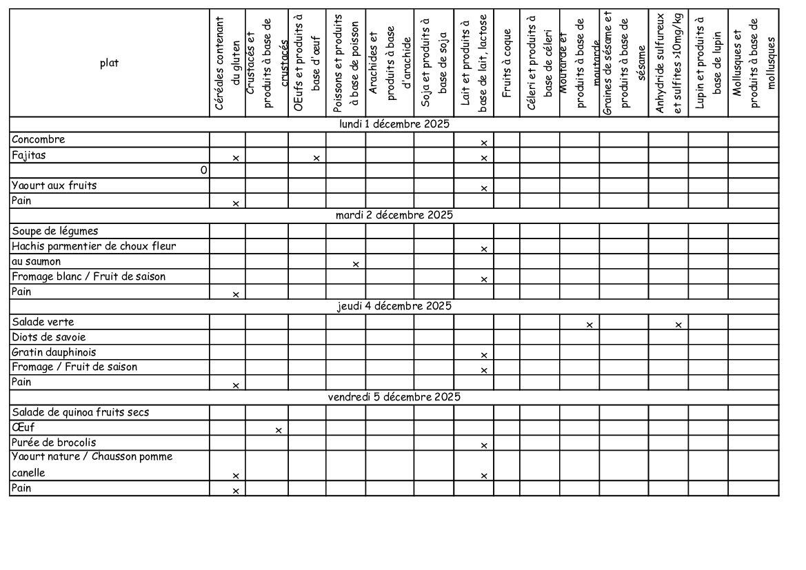 Voici le menu du mois de décembre 2025 et la liste des allergènes pour la semaine du 1er au 5 décembre 2025