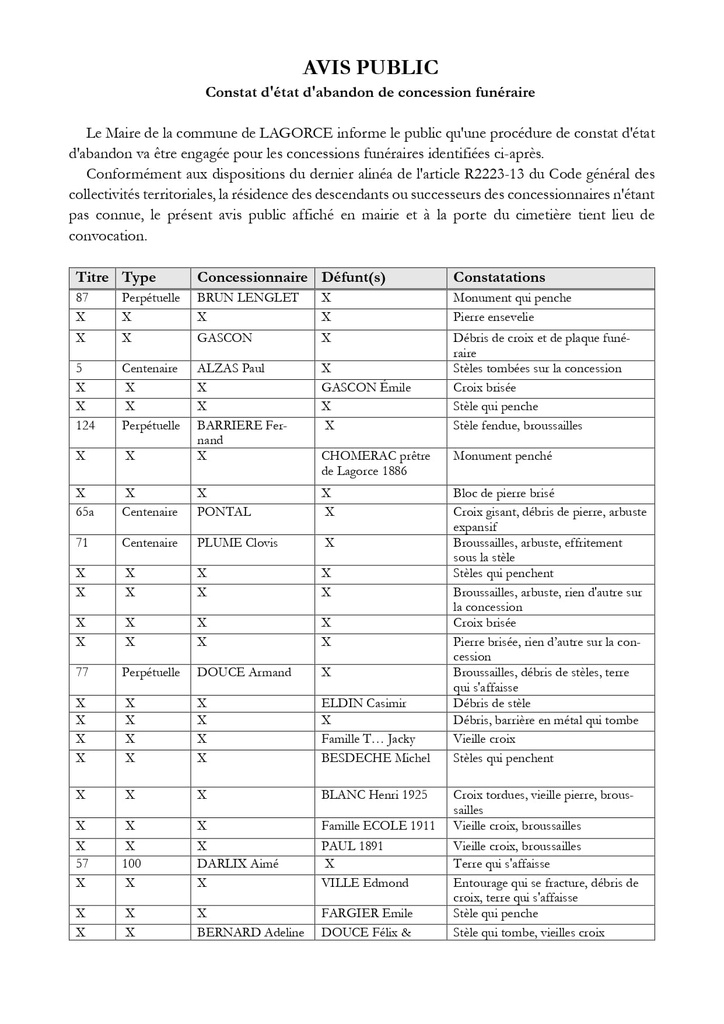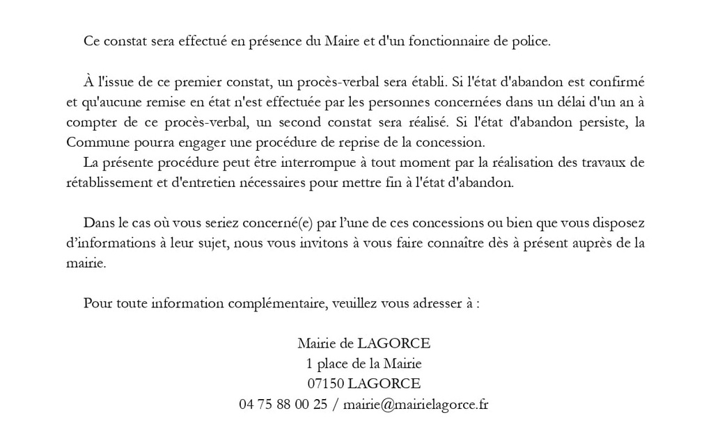 Ainsi, si vous êtes concerné(e) par l'une de ces concessions, votre présence lors de ce constat n'est pas indispensable, nous vous invitons simplement à vous faire connaître au cours de l'année qui vient, auprès de la mairie.