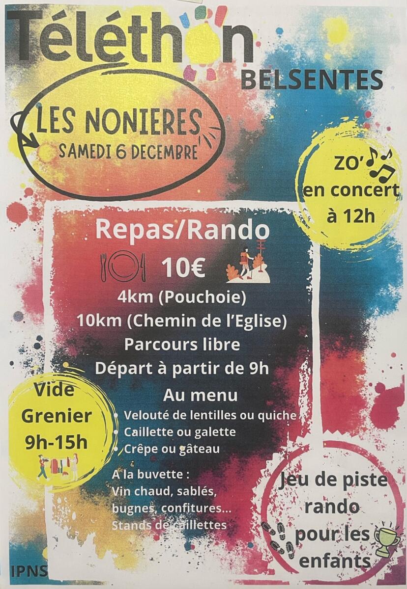 - Le samedi 6 décembre aux Nonières : de 9h à 15h un vide-grenier, à partir de 9h une rando/repas avec 2 parcours et un jeu de piste pour les enfants (4 km par Pouchoie ou 10 km par le chemin de l’Église), à 12h Zo’, chanteuse locale, animera le repas.