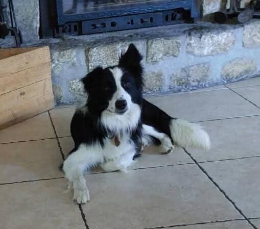 Chien perdu sur la commune et les alentours : border collie portant un collier orange, chien craintif.