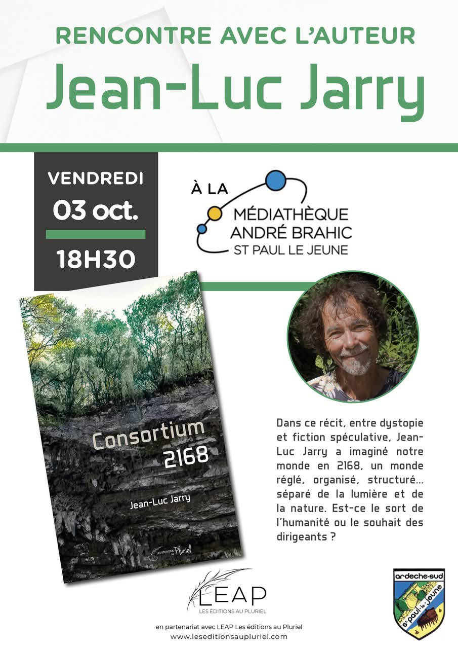 NOS RENCONTRES D'AUTEURS avec  Les Editions au Pluriel à la médiathèque André Brahic le vendredi 3 octobre à 18h30 venez rencontrer Jean-Luc Jarry qui présentera son livre