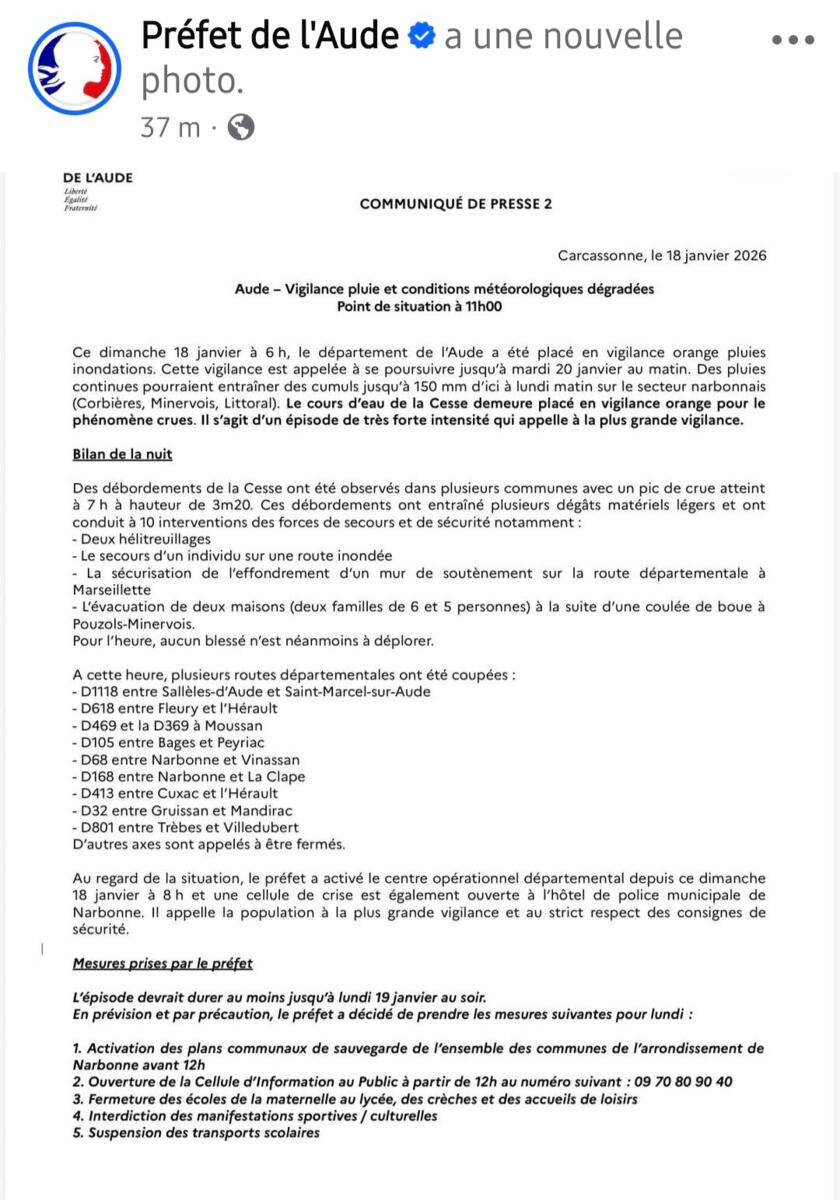 ⚠️⚠️Alerte de la préfecture de l'Aude⚠️⚠️