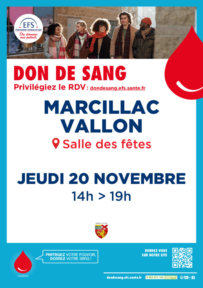 La prochaine campagne de don de sang aura lieu à la salle des fêtes de Marcillac le 20 novembre de 14h00 à 19h00.
