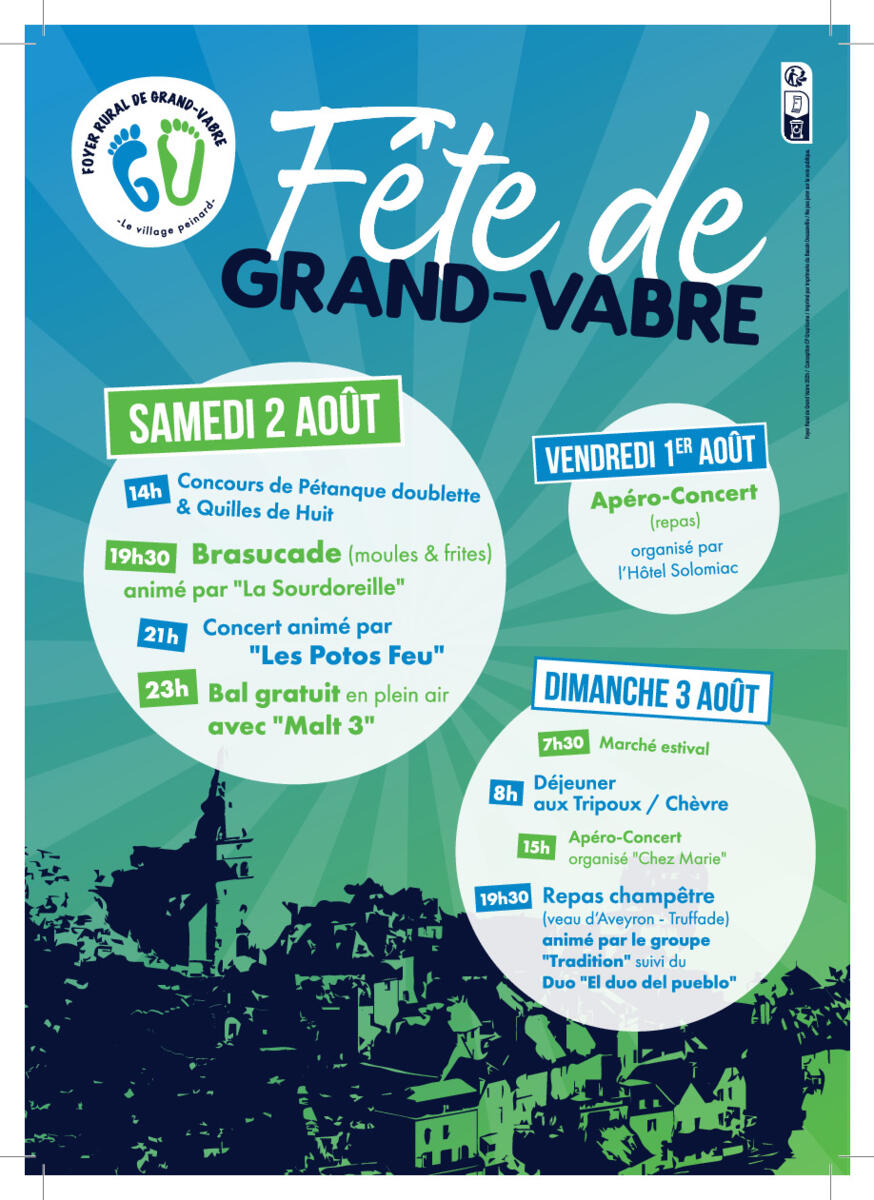 Le 1er, 2 et 3 Août, le foyer rural de Grand-Vabre organise la fête annuelle.