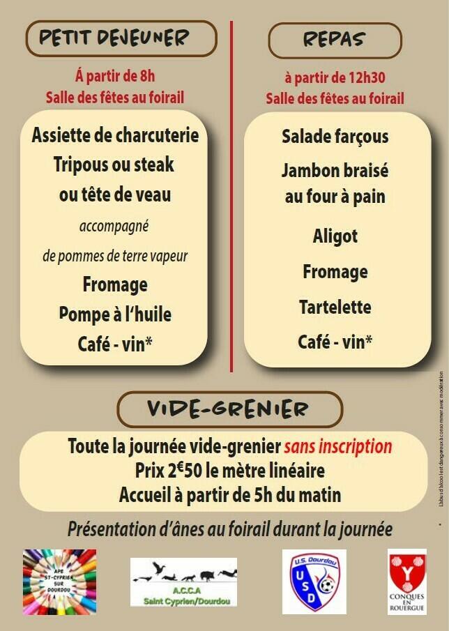 Petit-déjeuner aveyronnais (tripous, tête de veau, steak) dès 8h et repas jambon braisé dès 12h30 à la salle des fêtes (renseignements repas : ape.stcyprien12@gmail.com).
