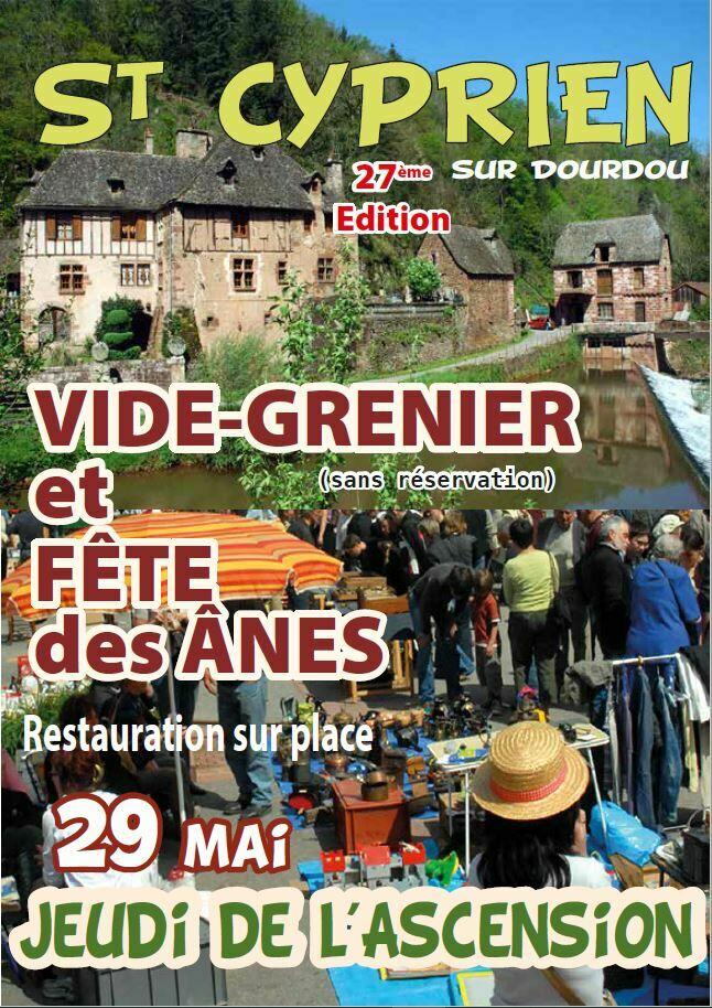 Jeudi de l'Ascension (29 mai 2025) : 27e Vide-grenier et Fête des ânes à Saint-Cyprien-sur-Dourdou co-organisés par l'APE de Saint-cyprien, l'US Dourdou et la Société de chasse.