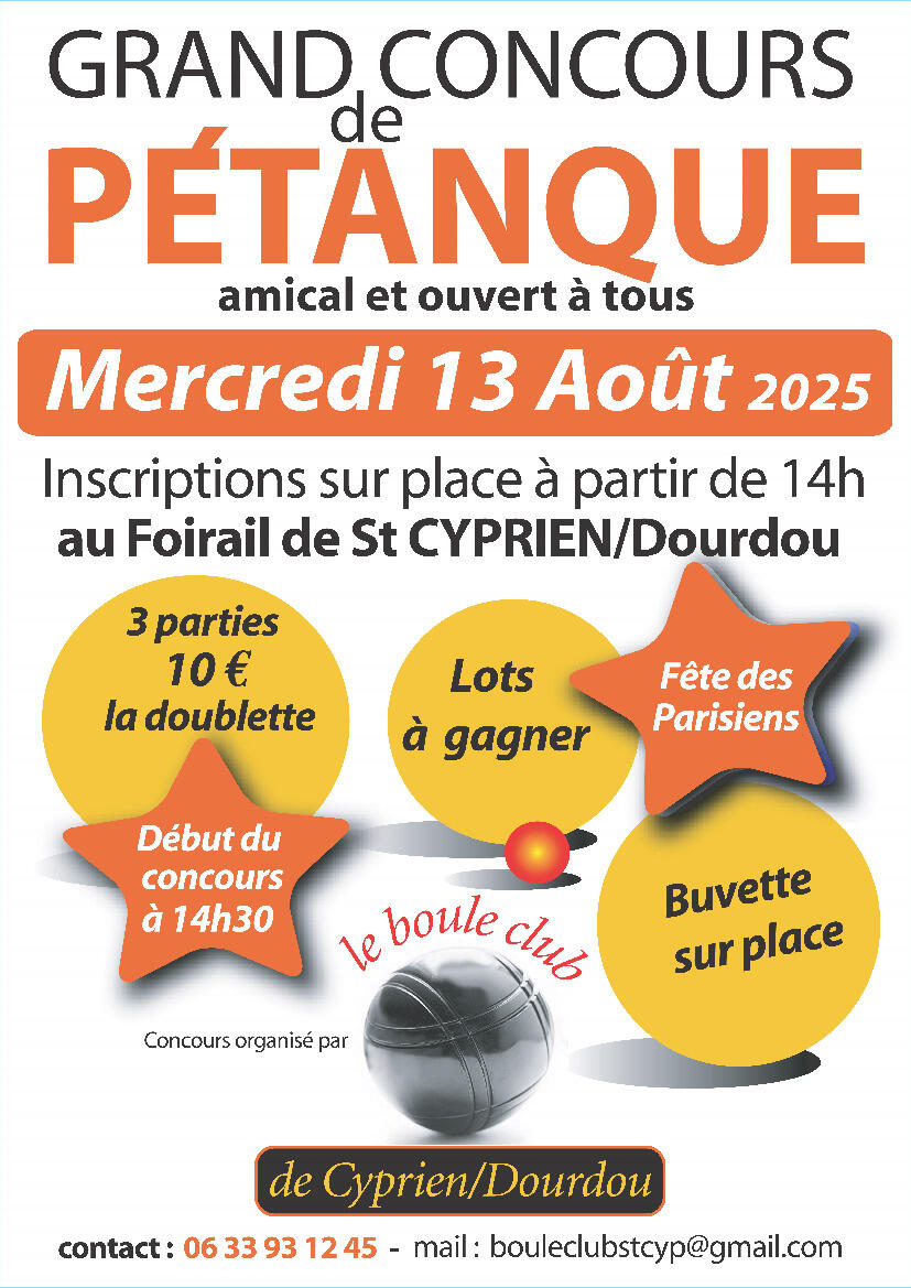 Le boule club de St Cyprien organise un grand concours de pétanque amical, ouvert à tous le mercredi 13 août à 14h sur le foirail de St Cyprien.