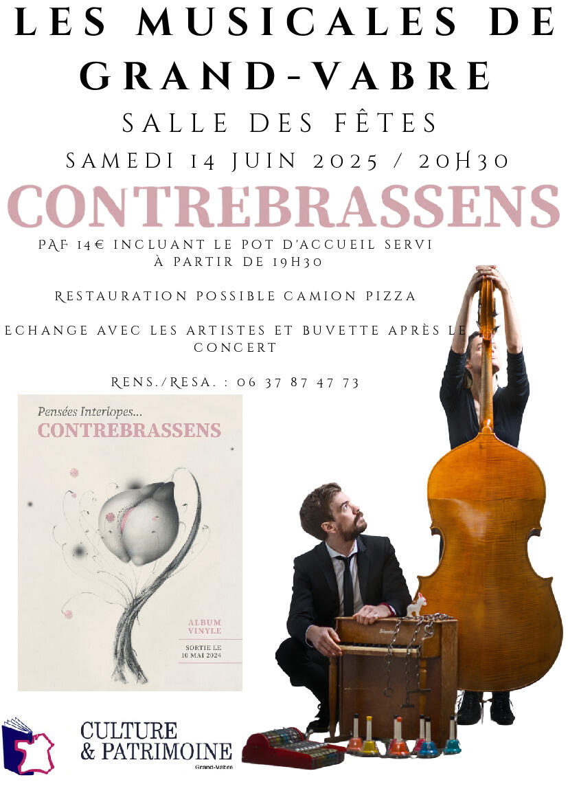 L'Association Culture & Patrimoine de Grand-Vabre vous donne rendez-vous le 14 juin à 20h30 à la salle des Fêtes de Grand-Vabre dans le cadre des "Musicales de printemps" pour le concert "CONTREBRASSENS" avec Pauline DUPUY au chant et à la contrebasse et Michael WOOKEY, multi musicien.