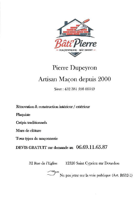 Un nouvel artisan maçon, Pierre Dupeyron, s'est installé à Saint-Cyprien. Ci-joint ses coordonnées.