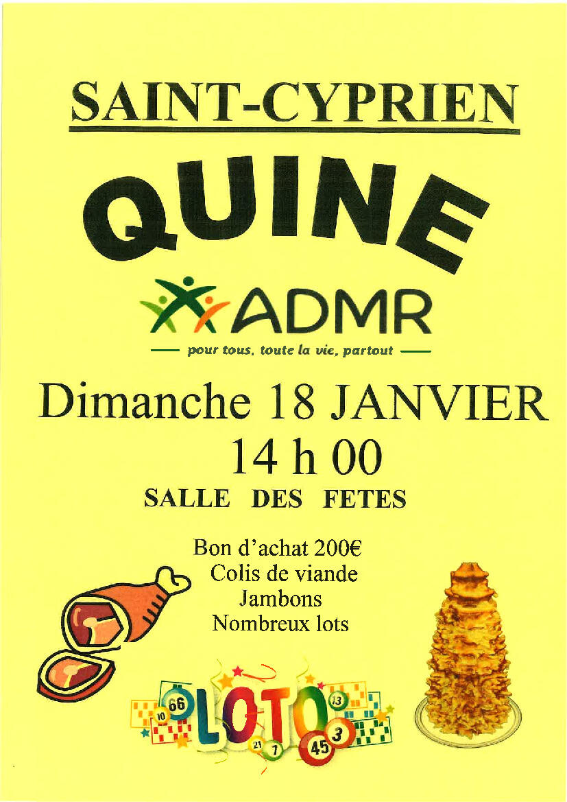 La quine de l'ADMR aura lieu le 18 Janvier à 14h00, salle polyvalente de Saint-Cyprien.