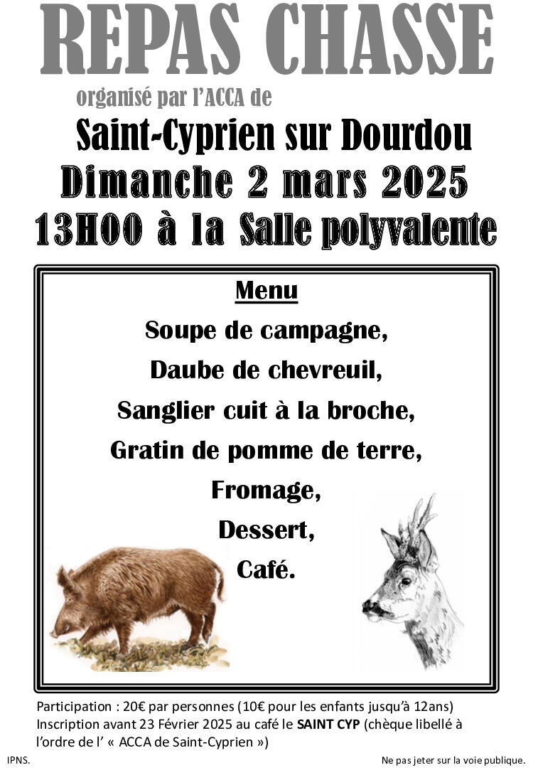 L'ACCA Saint-Cyprien organise le repas de chasse annuel le dimanche 2 Mars à 13h00, salle polyvalente.