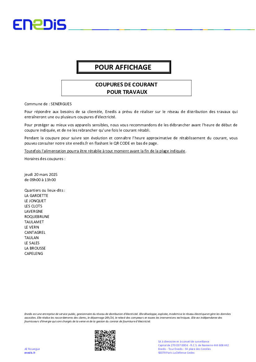 Enedis vous informe d'une coupure de courant pour travaux concernant la commune de SENERGUES.