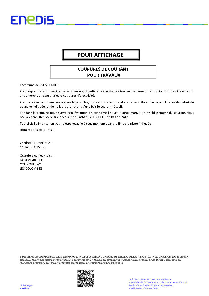 Enedis vous informe d'une coupure de courant pour travaux concernant la commune de SENERGUES.