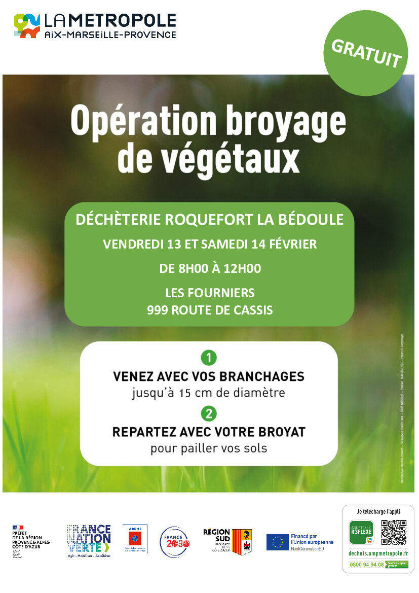 Une nouvelle opération gratuite de broyage de végétaux est organisée par Aix-Marseille-Provence Métropole le vendredi 13 et samedi 14 février, à la déchèterie des Fourniers de Roquefort-La Bédoule.