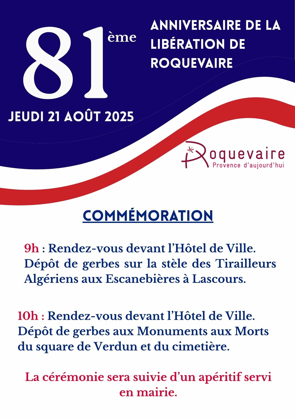 Nous vous donnons rendez-vous pour la commémoration du 81ᵉ anniversaire de la Libération de Roquevaire le 21 août 2025 !