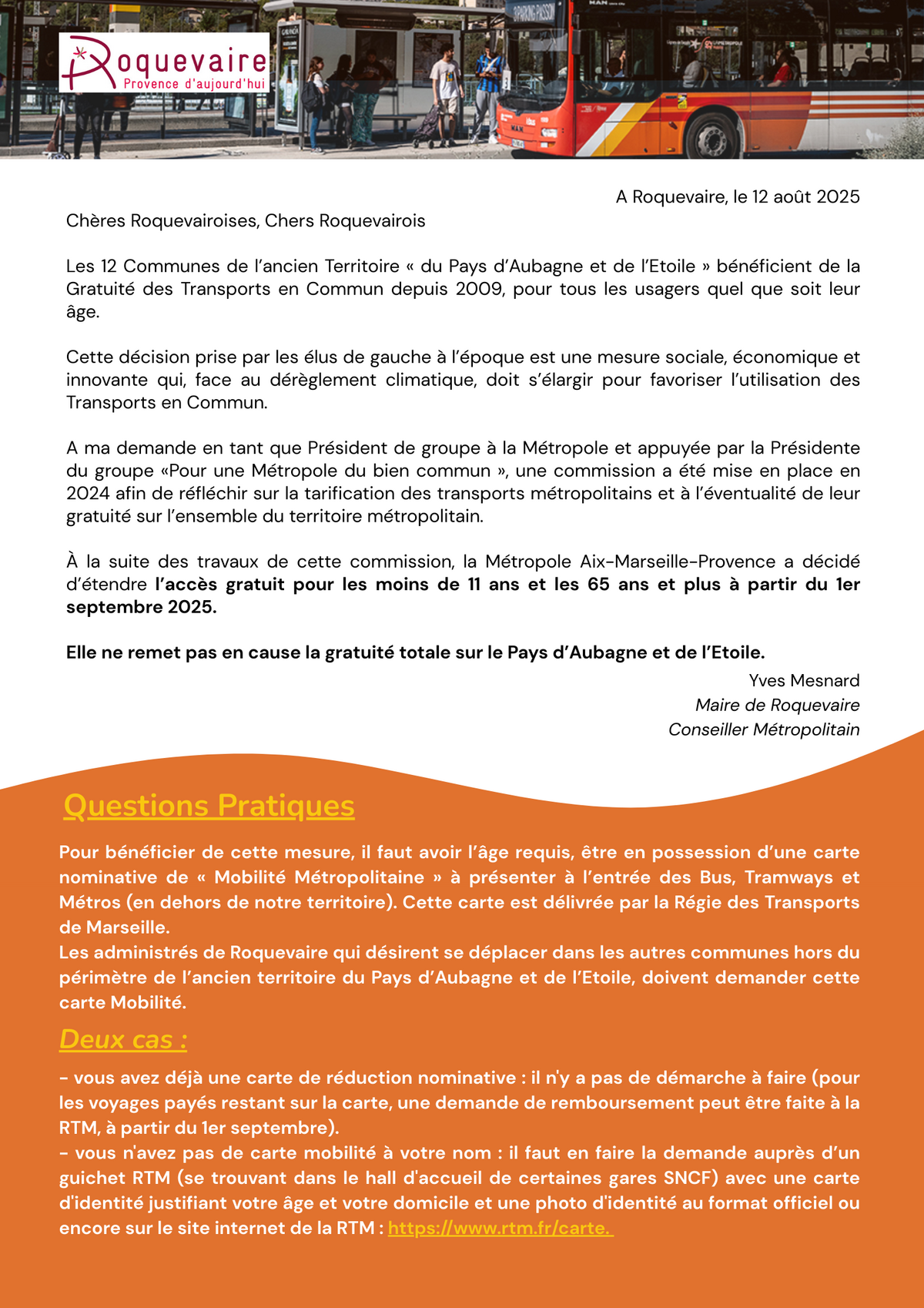 🟧 COURRIER DU MAIRE 🟧 8/12/25  🟧 EXTENSION DE LA GRATUITÉ DES TRANSPORTS POUR LES MOINS DE 11 ANS ET LES 65 ANS ET PLUS. 🟧 Â