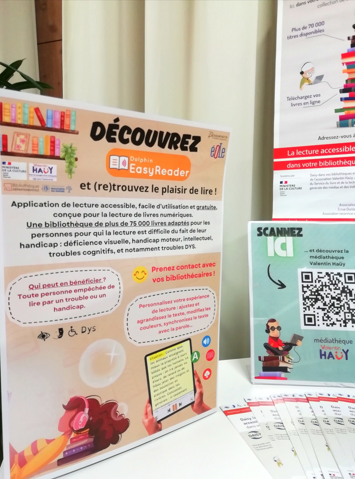 👉Qui peut en bénéficier ? Toute personne empêchée de lire dû à un handicap ou un trouble cognitif, sur présentation d’un justificatif individuel (certificat médical ou paramédical), copie de la carte d’invalidité… : prenez contact avec les bibliothécaires !