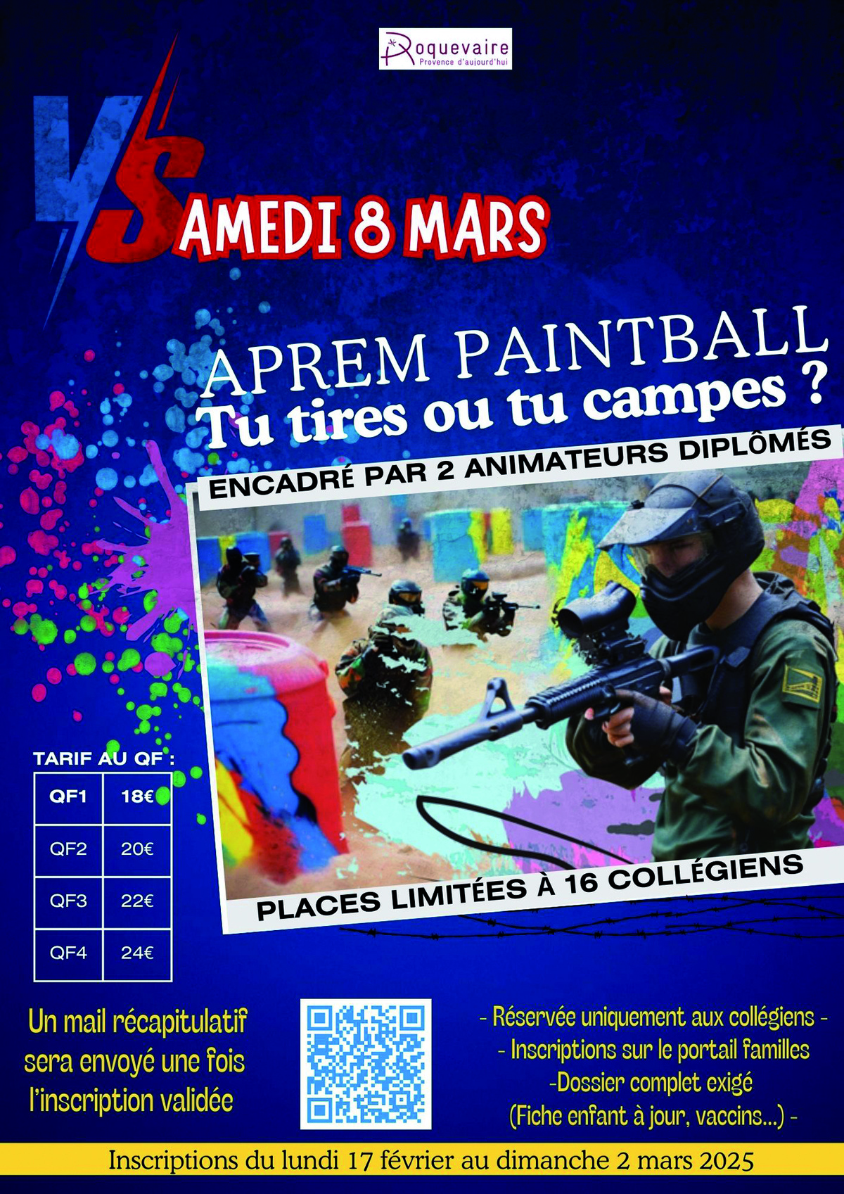 L’équipe d’animation de l’EAC propose à 16 collégiens, une sortie PAINTBALL le samedi 8 mars après-midi, encadrée par 2 animateurs diplômés.