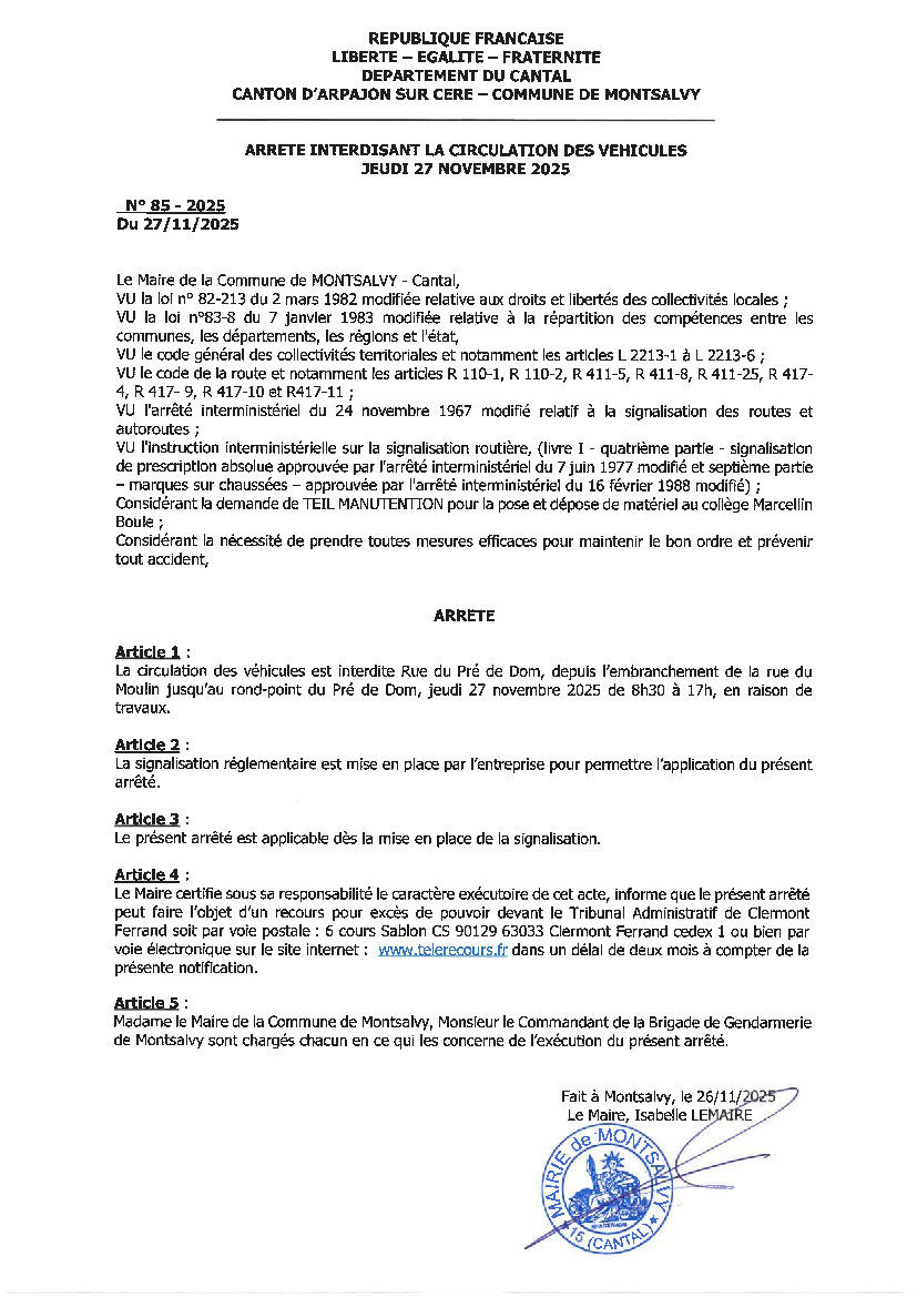 ARRETE D'INTERDICTION DE CIRCULER RUE DU PRE DE DOM LE 27/11