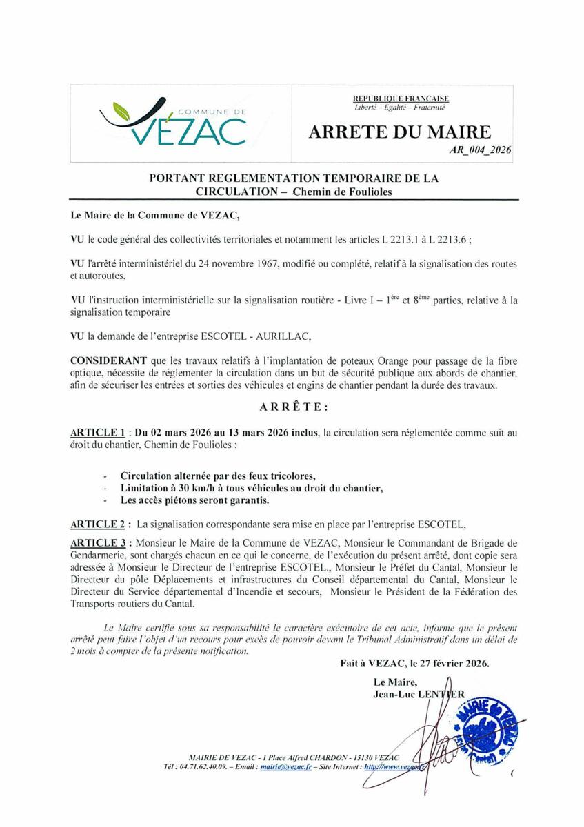 ARRETE PORTANT REGLEMENTATION TEMPORAIRE DE LA CIRCULATION 3/3/26 Travaux de fibre sur le hameau de Foulioles jusqu'au 13 Mars 2026.