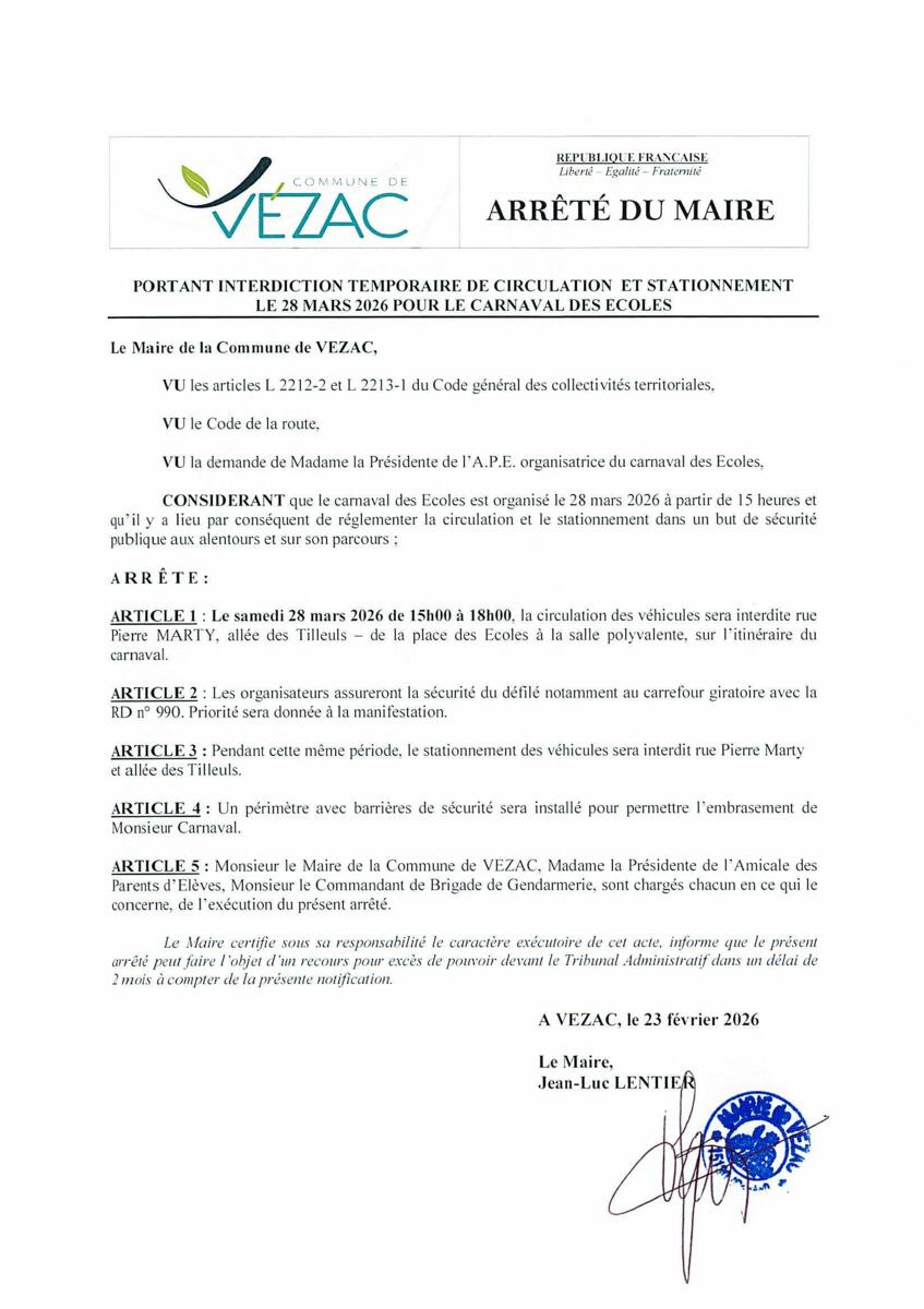 Veuillez trouver ci-joint un arrêté qui règlemente la circulation le jour du Carnaval des écoles.