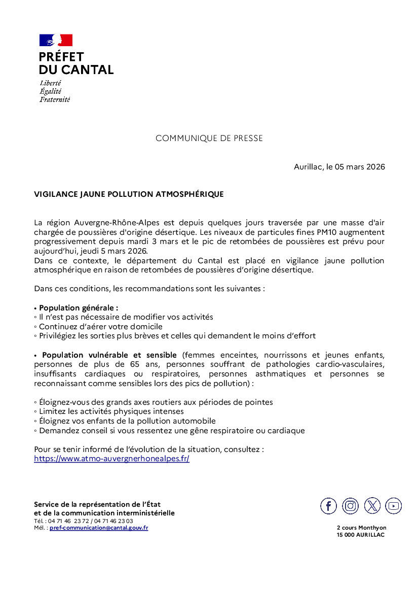 Je vous informe que le département du Cantal est placé ce jour en vigilance jaune pour pollution atmosphérique.