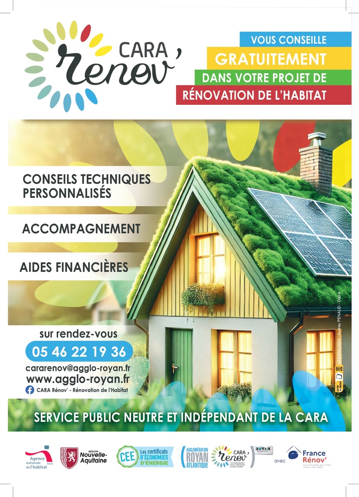 → CARARénov’ est le service public de référence pour accompagner les particuliers : Service public indépendant, neutre et gratuit de la Communauté d'Agglomération Royan Atlantique | https://www.agglo-royan.fr/cara-renov | https://www.facebook.com/cararenov/