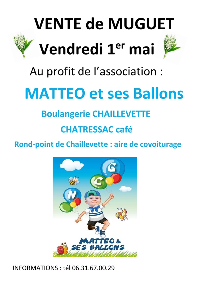 Du muguet pour Mattéo 4/10/26 Profitez d'une VENTE DE MUGUET au profit d'une association à but non lucratif le 1er Mai à CHAILLEVETTE