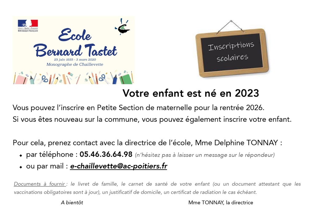 / INSCRIPTIONS 2026 À L'ÉCOLE DE CHAILLEVETTE