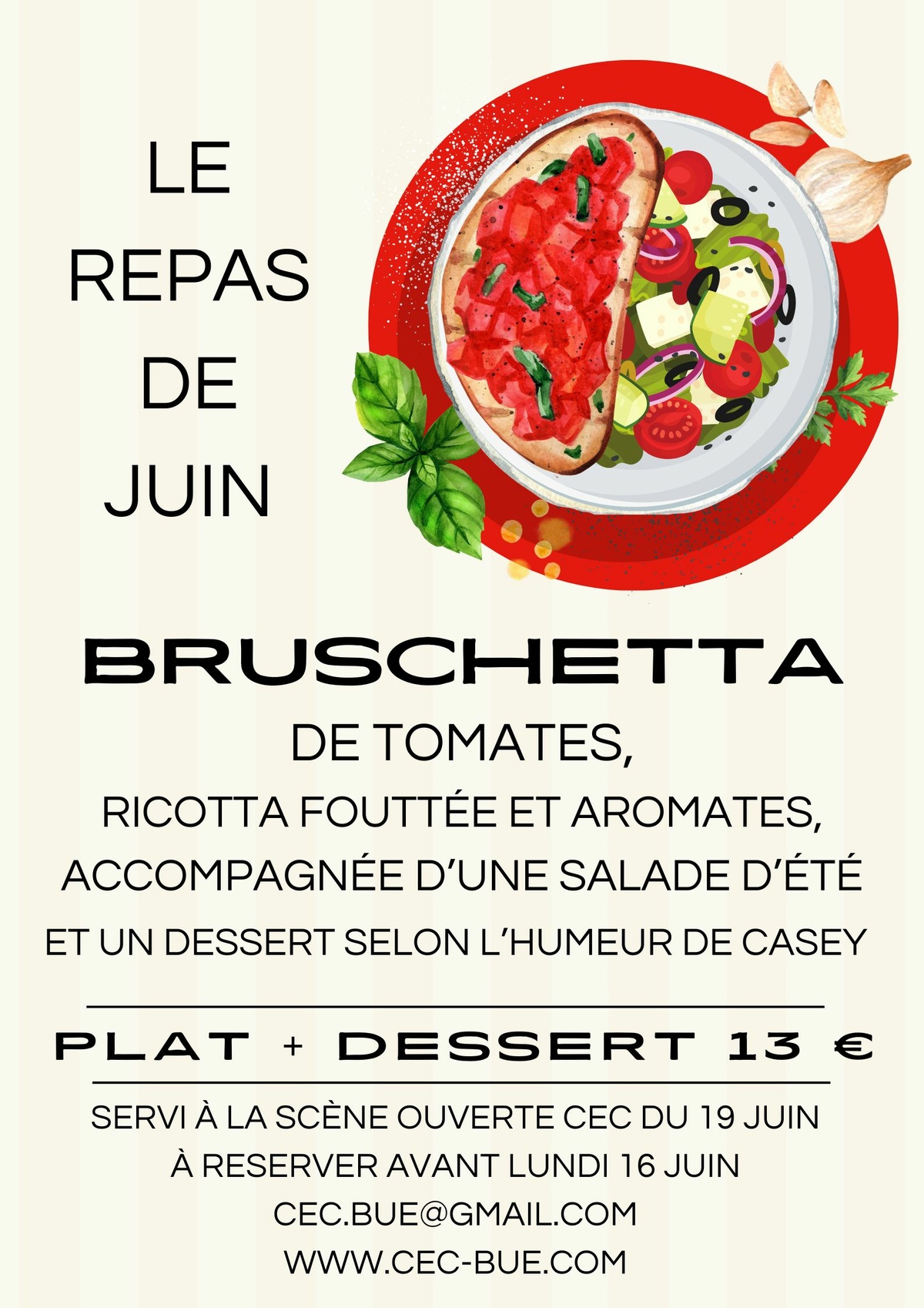 Repas maison : la bruschetta de tomates sur ricotta fouettée et aromates, accompagnée d'une salade d'été, et dessert maison selon l'humeur de Casey. 13€, réserver avant le lundi 16, par e-mail ou sur le site. Servi à partir de 20h.