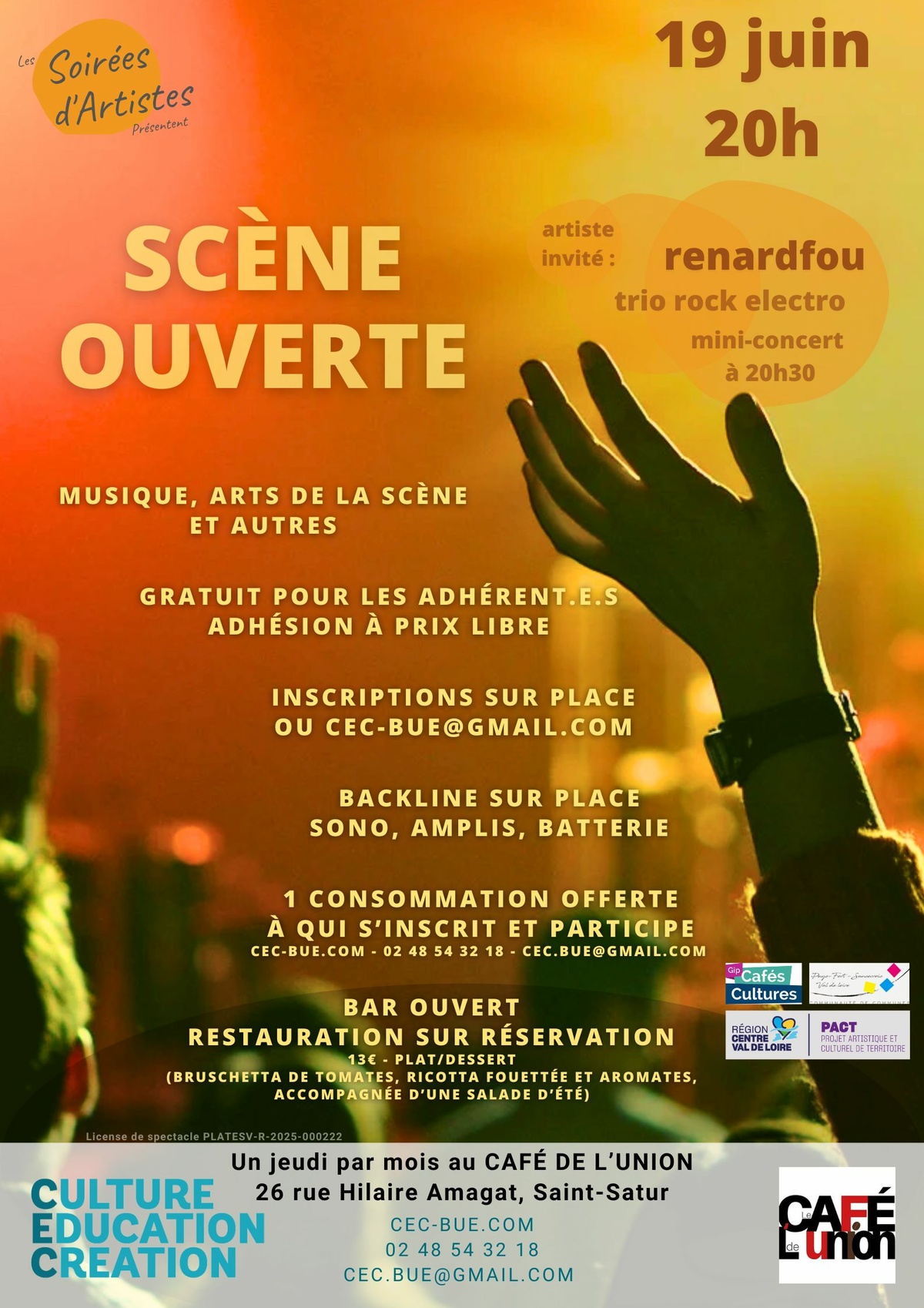 À partir de 20h au Café de l'Union, 26 rue Amagat, Saint-Satur (18). Mini-concert à 20h30, Scène Ouverte à 21h.