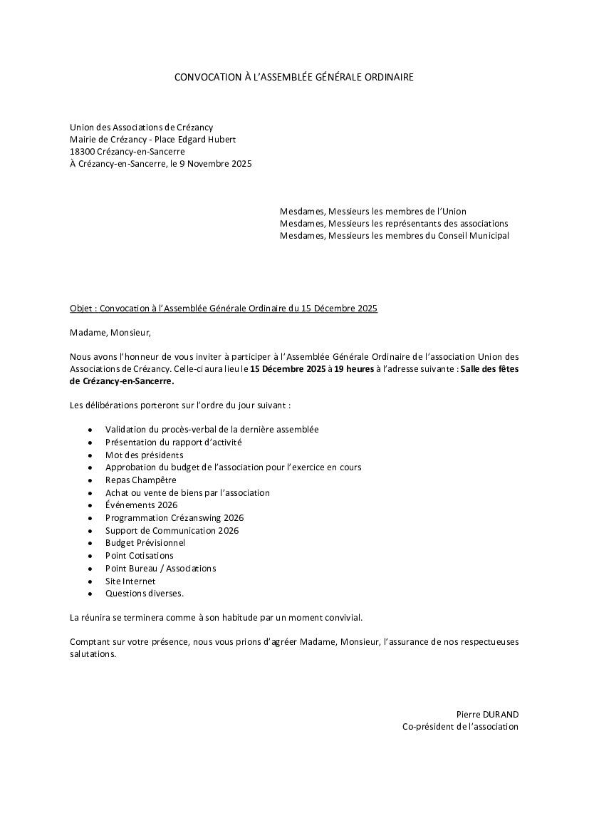 CONVOCATION À L’ASSEMBLÉE GÉNÉRALE ORDINAIRE
